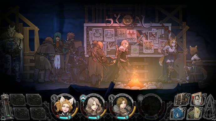 There's also some color added to the mercenaries you recruit. They're pulled at random from a pool comprised of five different races and 10 classes, but they each have their own name and look. The character art is simply fantastic; early on, you'll find yourself choosing the characters that look more interesting. You can even meet your chosen squad and talk to them directly in the local tavern, where they each have their own unique lines of dialog. If there's a part of Vambrace that succeeds wonderfully, it's this narrative and aesthetic layer.